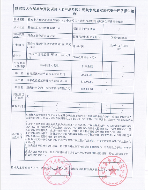 雅安市大興湖旅游開發(fā)項(xiàng)目(水中島片區(qū))通航水域劃定通航安全評(píng)估報(bào)告編制單位中標(biāo)公告