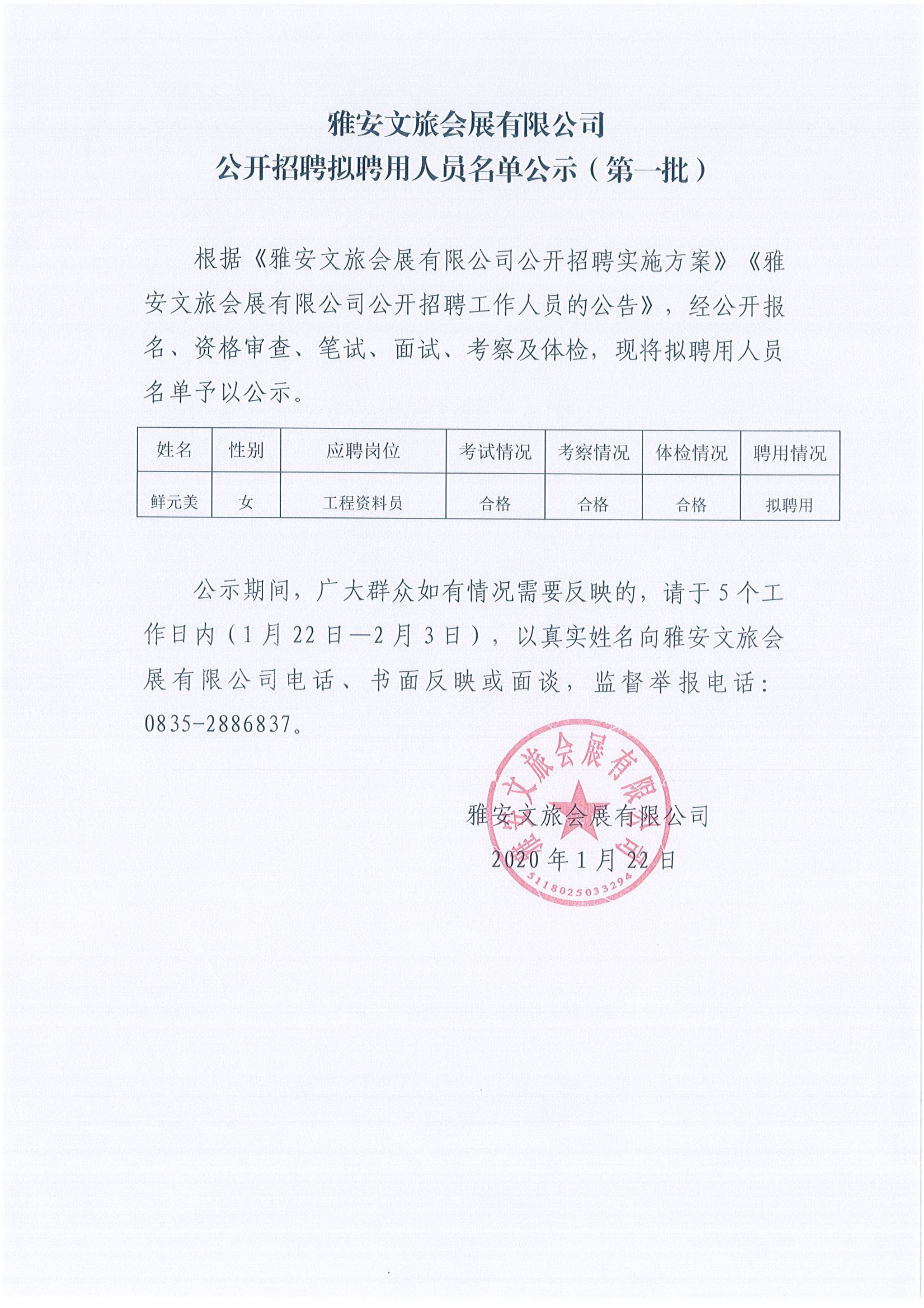 雅安文旅會展有限公司 公開招聘擬聘用人員名單公示(第一批)