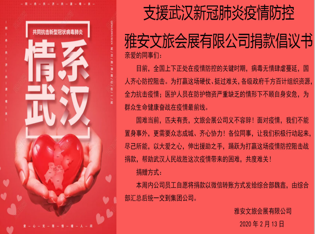 文旅會展公司黨員干部講政治勇?lián)?dāng)、迎嚴(yán)寒戰(zhàn)風(fēng)雪,義無反顧抗擊疫情最前沿,號召公司全體員工獻愛心支援武漢新冠肺炎疫情防控,募集愛心款4200元;帶動項目現(xiàn)場
