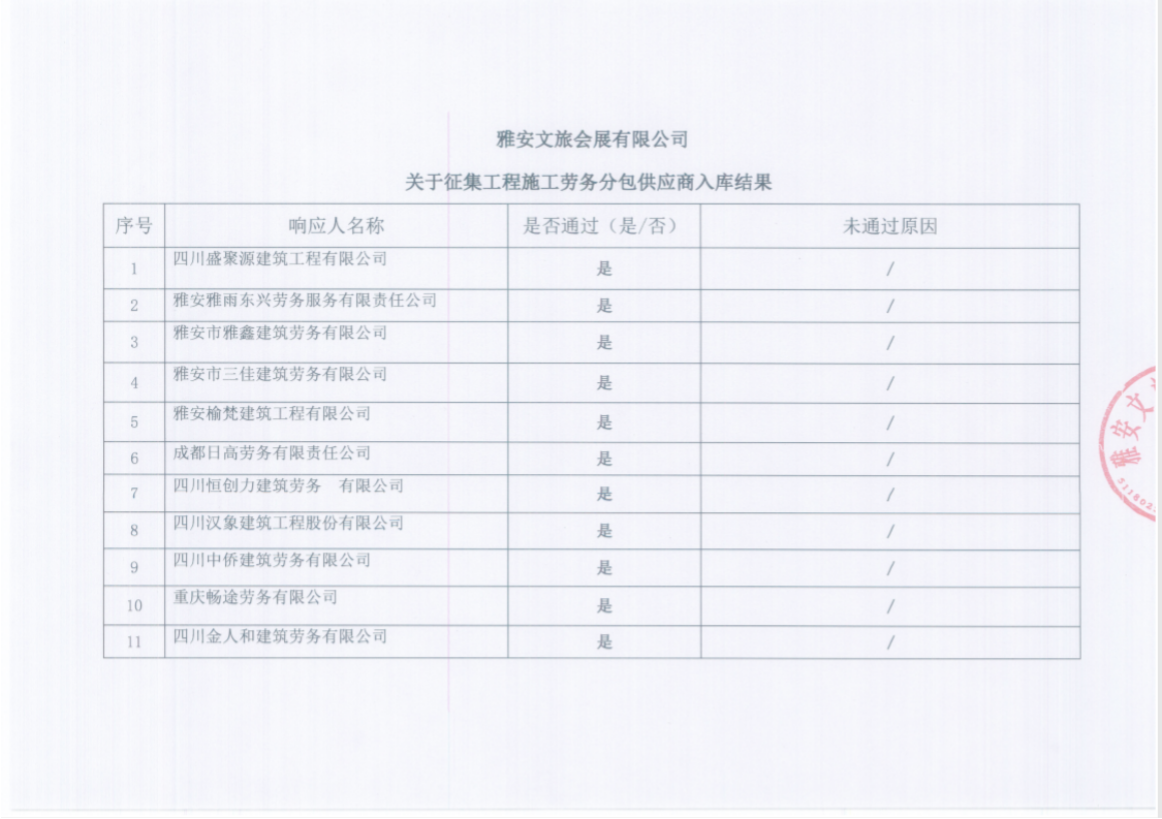 雅安文旅會展有限公司關(guān)于征集工程施工勞務(wù)分包供應(yīng)商入庫結(jié)果公示