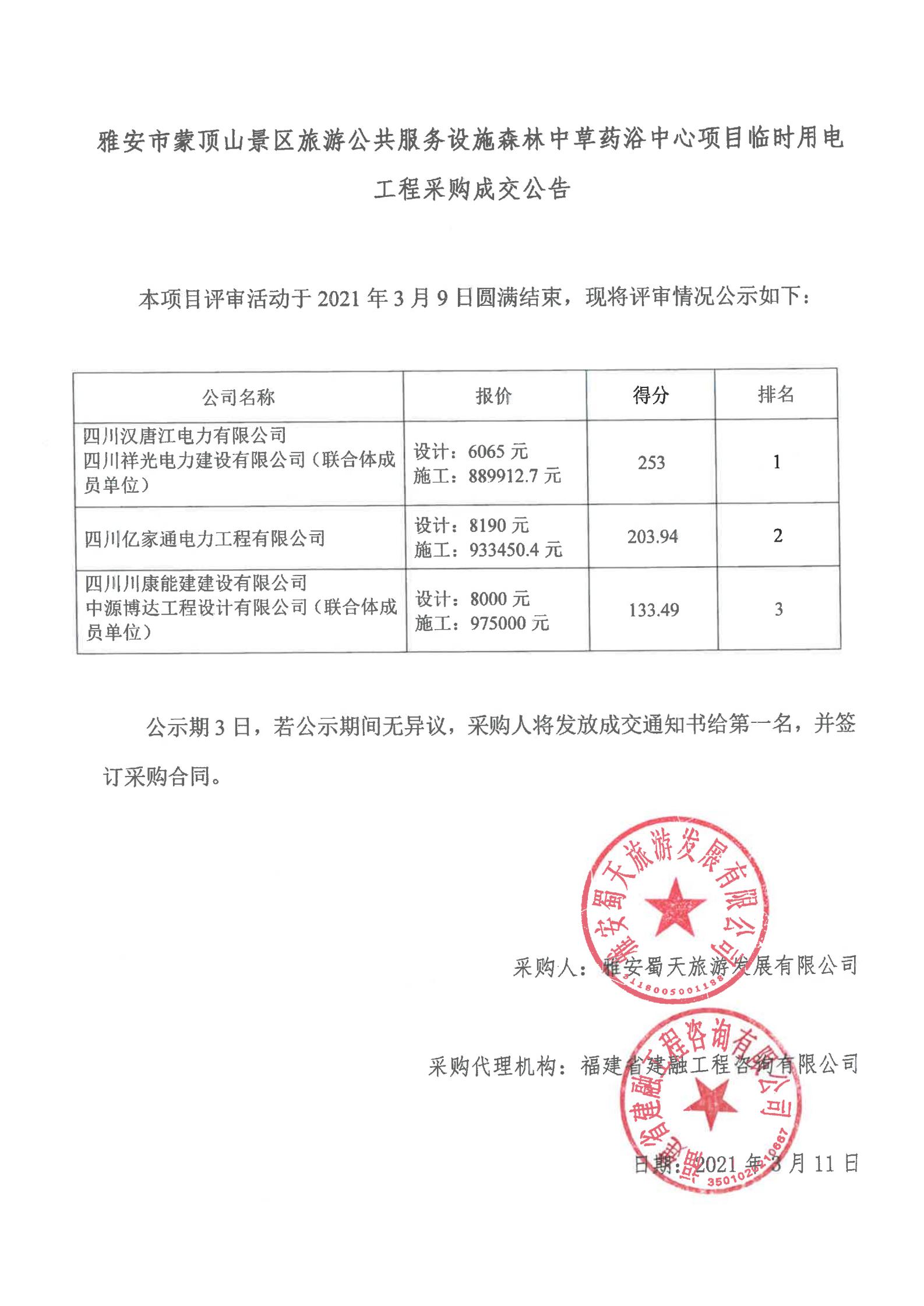雅安市蒙頂山景區(qū)旅游公共服務(wù)設(shè)施森林中草藥浴中心項(xiàng)目臨時(shí)用電工程采購成交公告