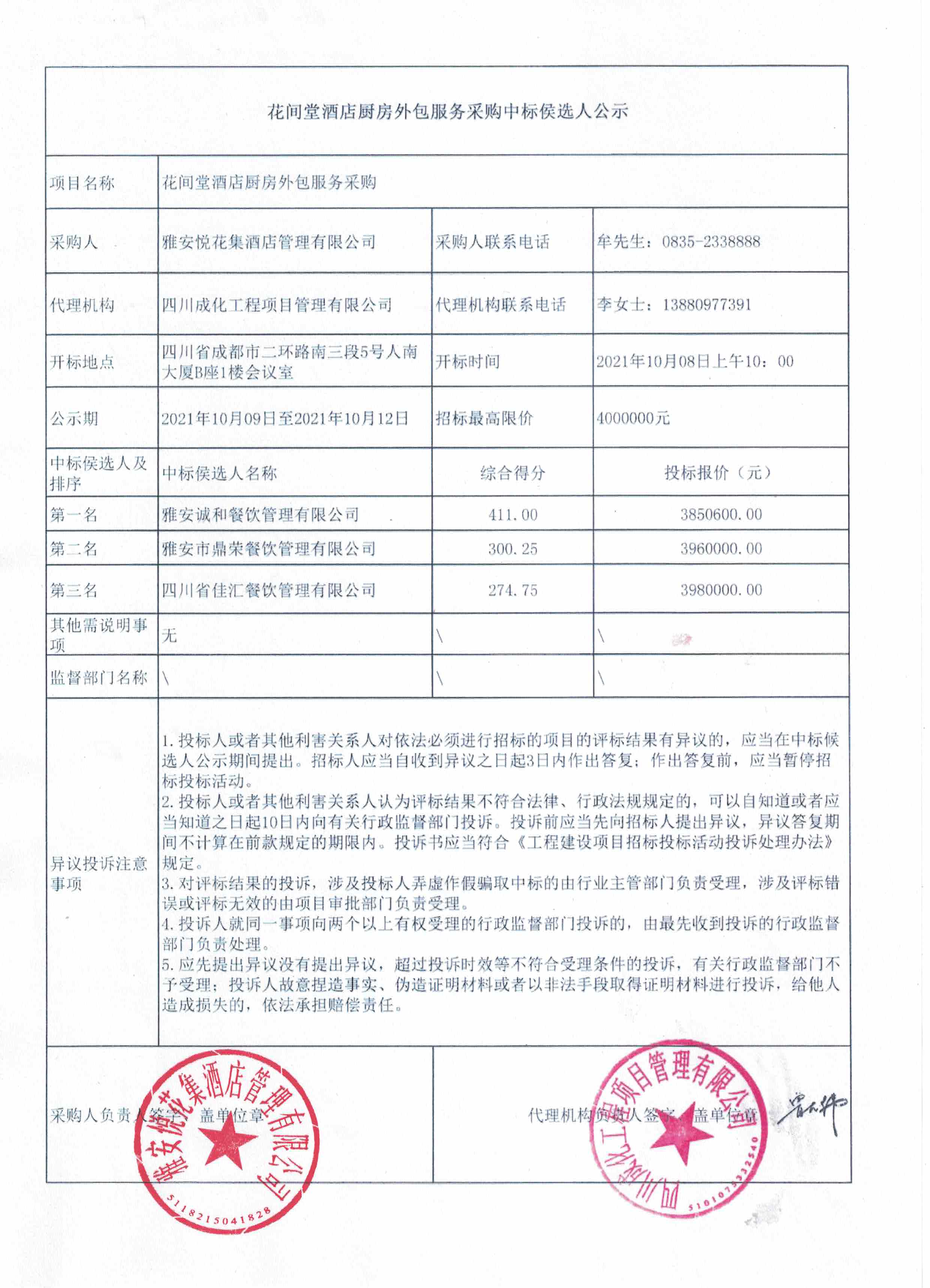 花間堂酒店廚房外包服務(wù)采購中標(biāo)候選人公示