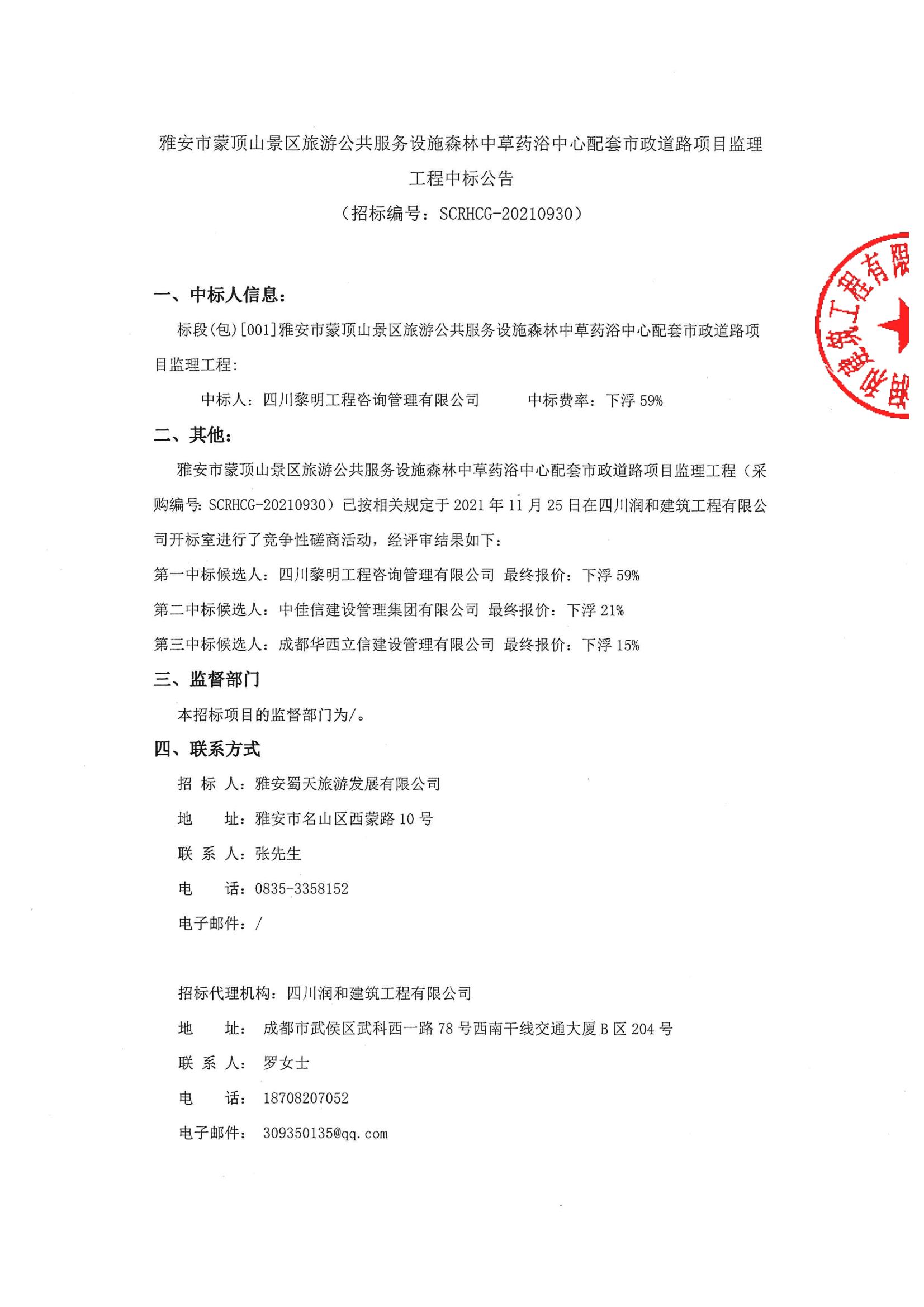雅安市蒙頂山景區(qū)旅游公共服務(wù)設(shè)施森林中草藥浴中心配套市政道路項目監(jiān)理工程中標公告