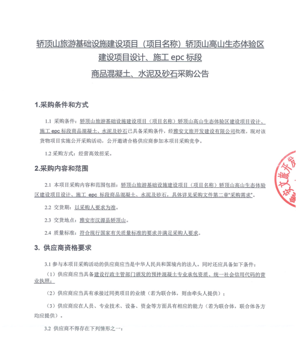 轎頂山旅游基礎(chǔ)設(shè)施建設(shè)項(xiàng)目 (項(xiàng)目名稱)轎頂山高山生態(tài)體驗(yàn)區(qū)建設(shè)項(xiàng)目設(shè)計、施工epc標(biāo)段商品混凝土、水泥及砂石采購公告